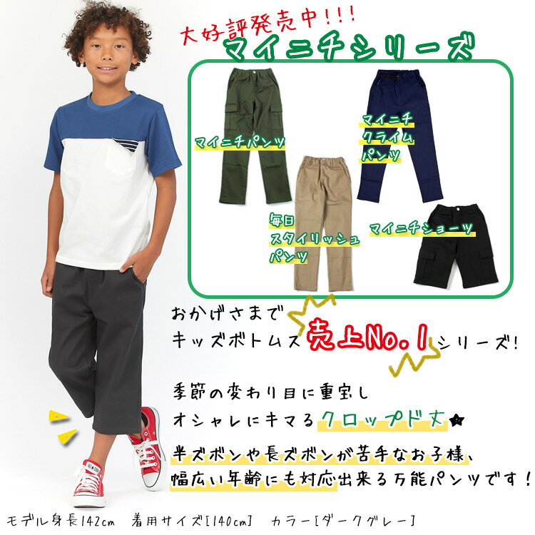 【使用用途 ※以下のようなシーンでご使用いただけます】 通学、お出かけ、遊び、自転車、キャンプ、アウトドア、ファミリーキャンプ、野外学習、フェス、水遊び、アスレチック、おうち時間 【贈り物に ※以下のような節目や祝い事でのプレゼントとしてもご好評いただいております】 お誕生日・バースデー・記念日・クリスマス・プレゼント・子供の日・孫の日 ※同シリーズでの画像です※ 商品説明 【月に1000本を売り上げる!毎日穿きたい“マイニチシリーズ"のクロップド丈パンツ★